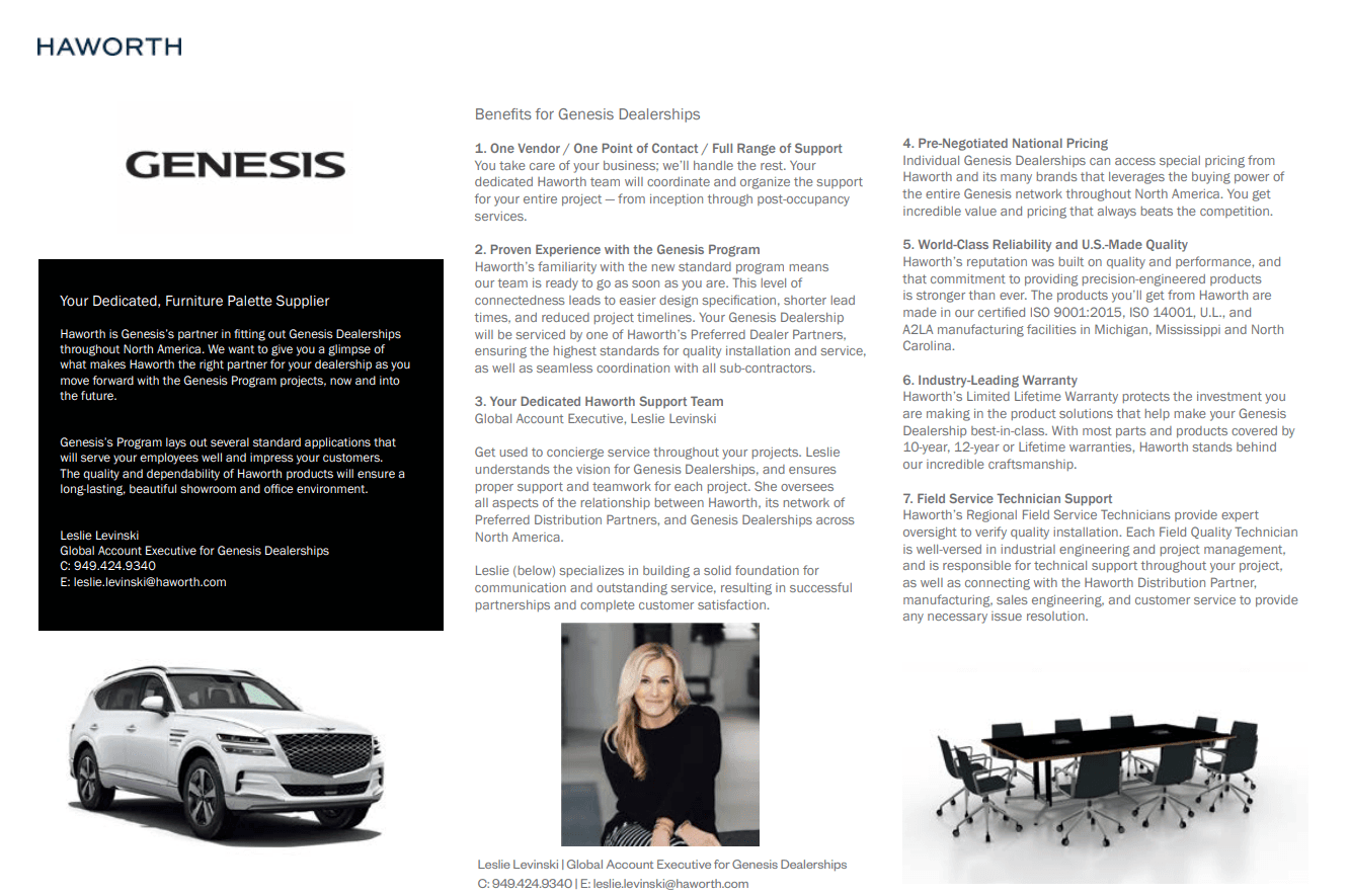 Thank you for visiting your Genesis support site. This tool will assist you as you partner with Haworth and our preferred dealer partners. Genesis established car dealership furniture standards to ensure brand and aesthetics throughout dealership showrooms are aligned. Genesis enforces the standards. Please let us know if you have any questions and if you would like to learn more about the solutions Haworth provides.