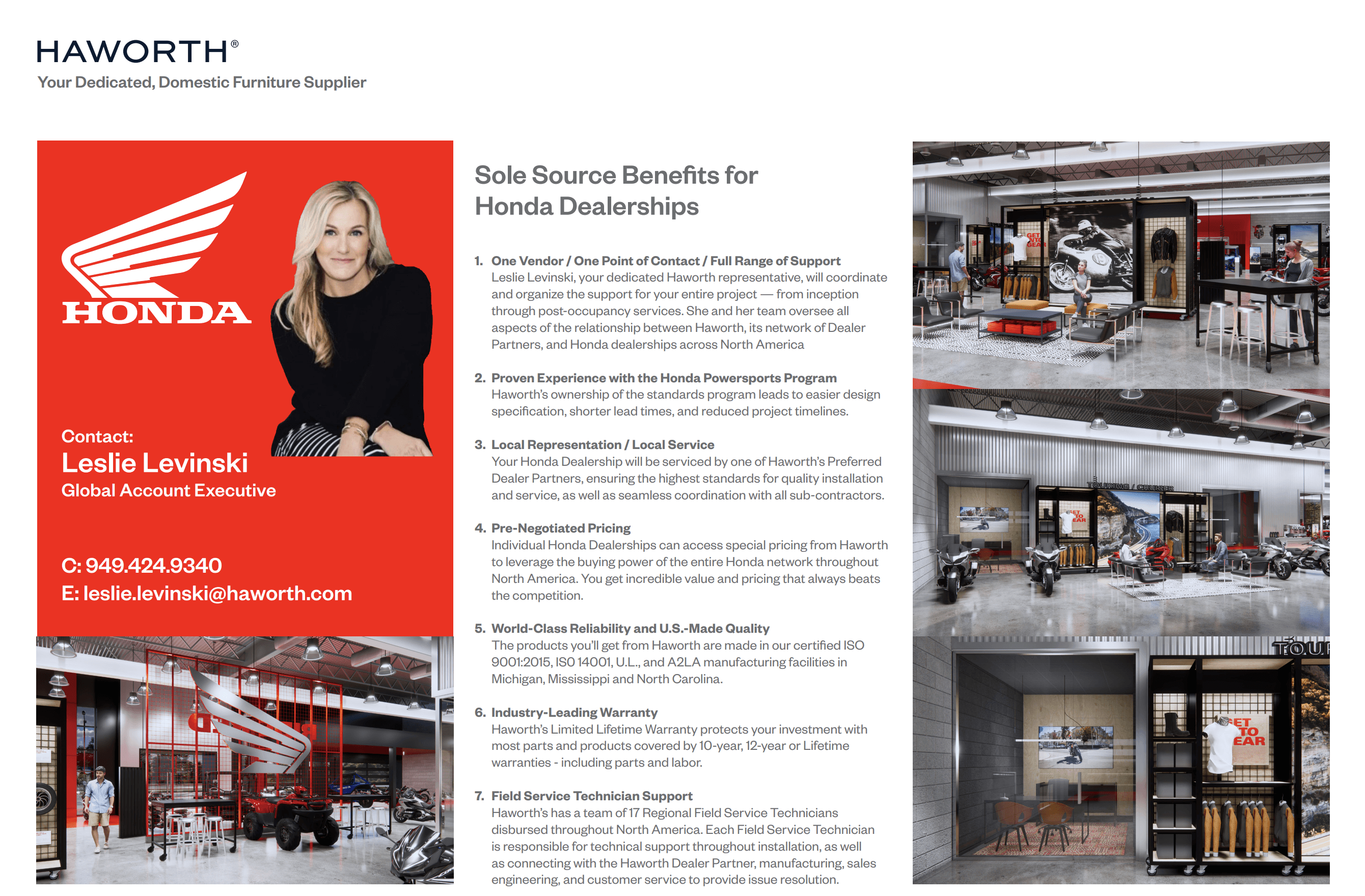 Honda Powersports established furniture standards to ensure brand and aesthetics throughout dealership showrooms are aligned. Haworth has partnered with Honda Powersports and ChangeUp to develop a complete furniture program which supports Honda's branding program.